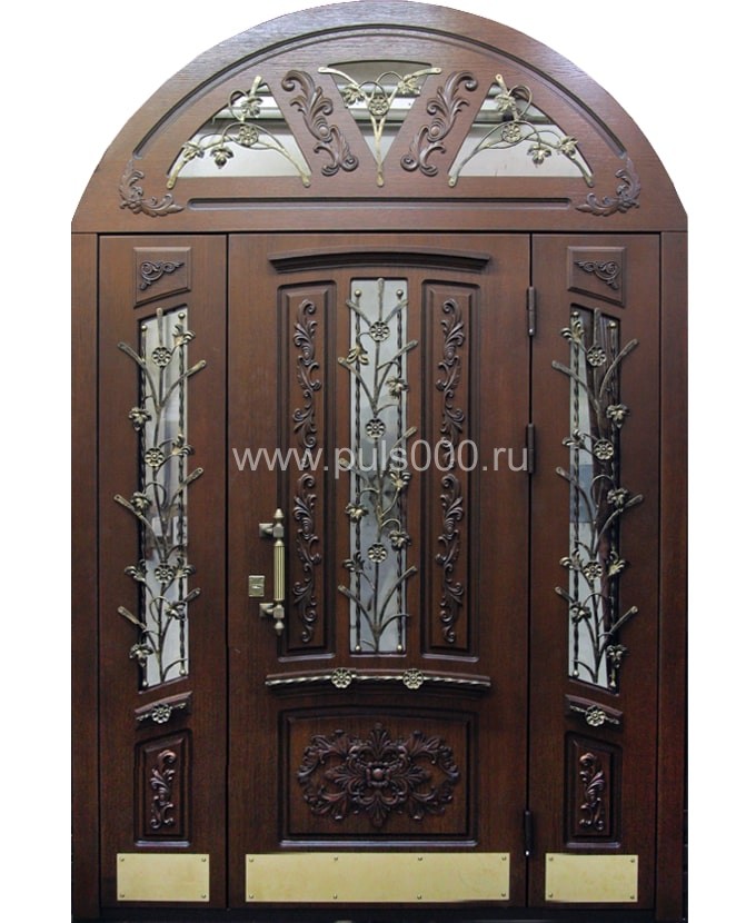 Шикарная металлическая парадная дверь по доступной цене. Сверху сталь покрыта массивом дерева, много кованых элементов, витража. Компания работает честно, слаженно, в сроки изготовления и доставки укладываются.
